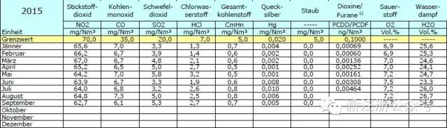雖然歐洲2000的排放標(biāo)準(zhǔn)是我們國內(nèi)所熟知和引用了,但是歐洲各國或地區(qū)所采用的標(biāo)準(zhǔn)則會(huì)比歐盟2000更為嚴(yán)格,以下圖為例,是Arnoldstein焚燒廠的最新排放公布數(shù)據(jù),其中黃色行則是Arnoldstein當(dāng)?shù)厮试S的排放標(biāo)準(zhǔn),我引用在此供大家參考,這一現(xiàn)象與我國各地簽訂BOT項(xiàng)目需要高于國家標(biāo)準(zhǔn)的情況類似。