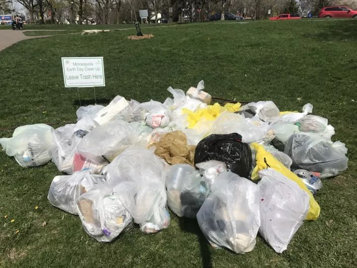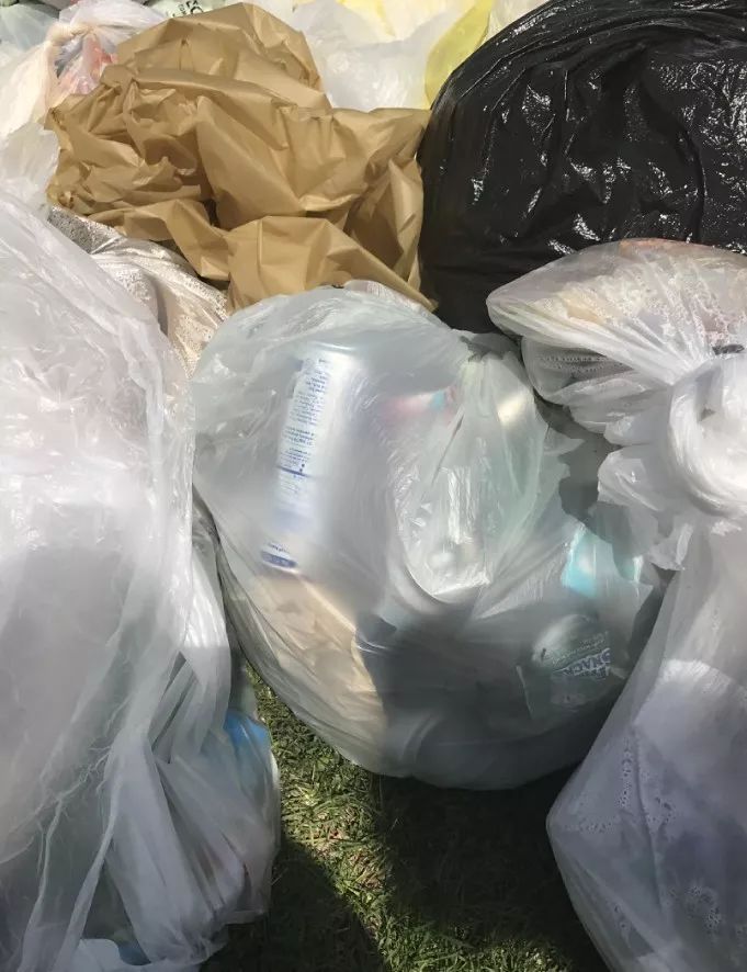 由于距離不遠(yuǎn),我們很快來到了公園門口,我們仔細(xì)地觀察了當(dāng)?shù)乩涞姆诸惽闆r,湊巧當(dāng)日為地球日,我們一行在公園門口遇到了志愿者收集的垃圾,并且分成了2堆擺放?;趪?yán)謹(jǐn)務(wù)實的工作作風(fēng)和對國內(nèi)崇洋媚外宣傳的不屑,我們持著懷疑地態(tài)度詳細(xì)驗證了一下老美的分類是否真的做的那么完善,我們對2堆垃圾袋進(jìn)行了拍照取樣。