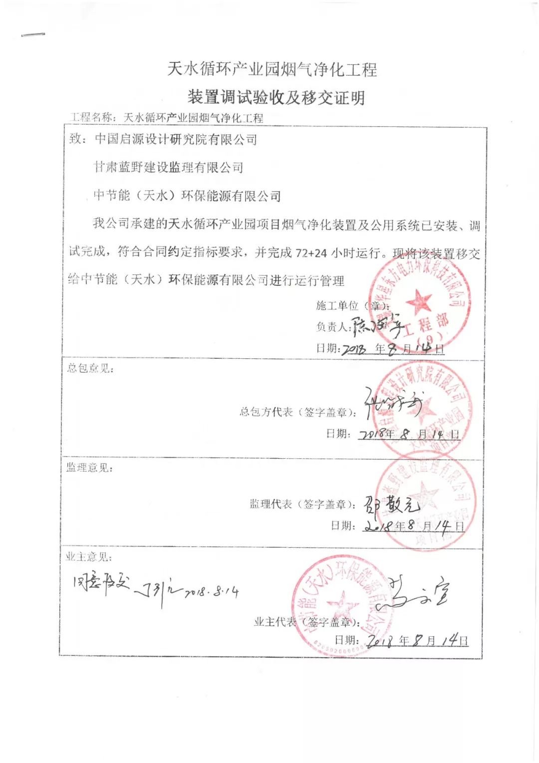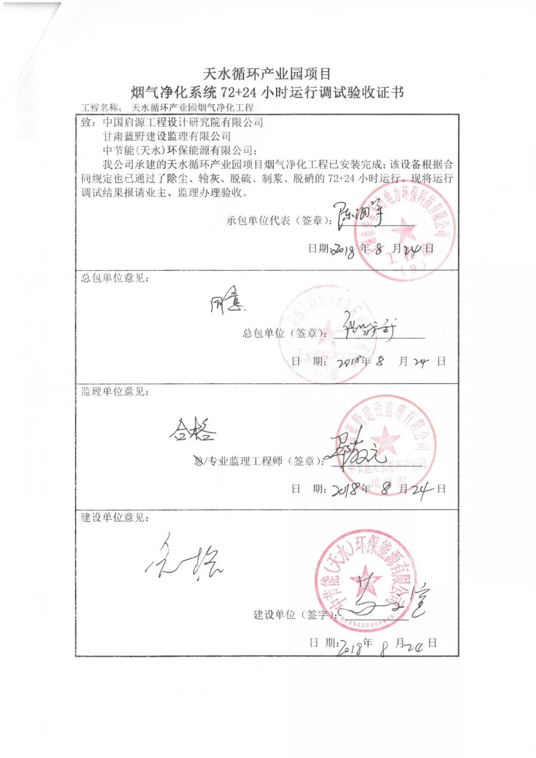 天水循環(huán)產(chǎn)業(yè)園1x600t/d生活垃圾焚燒煙氣凈化工程項(xiàng)目竣工驗(yàn)收