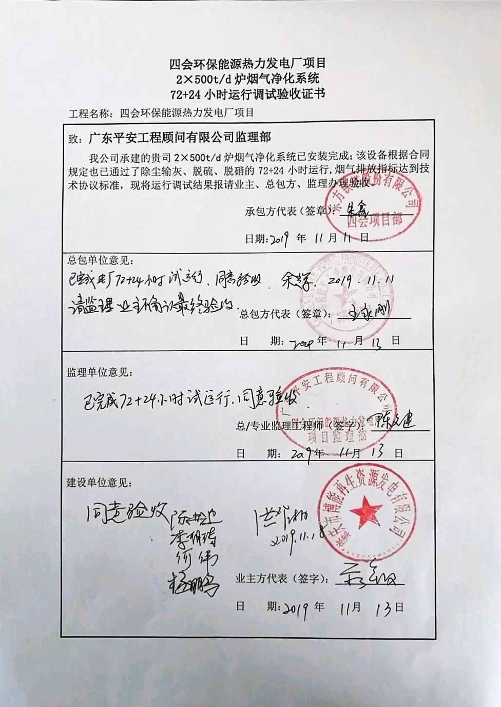 我公司承建的四會環(huán)保能源熱力發(fā)電廠項目煙氣凈化工程于2019年11月11日通過72+24小時運(yùn)行驗收。