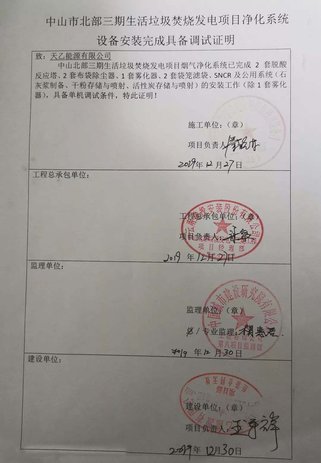 我公司承建的中山市北部垃圾綜合處理基地垃圾焚燒發(fā)電廠和垃圾滲濾液處理廠三期工程于2019年12月30日通過調(diào)試驗收。