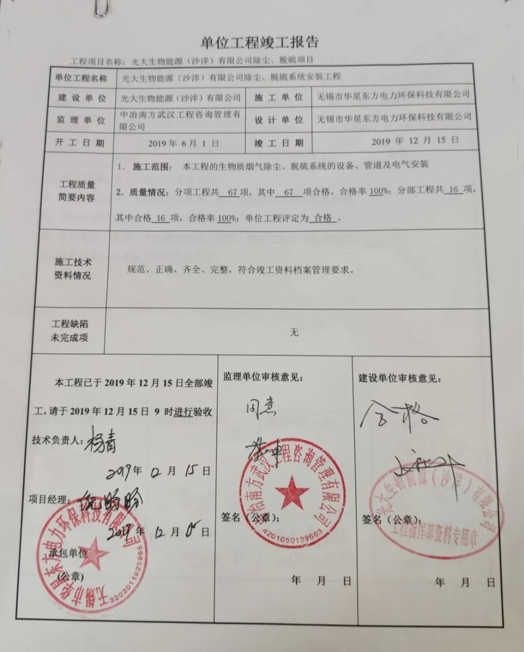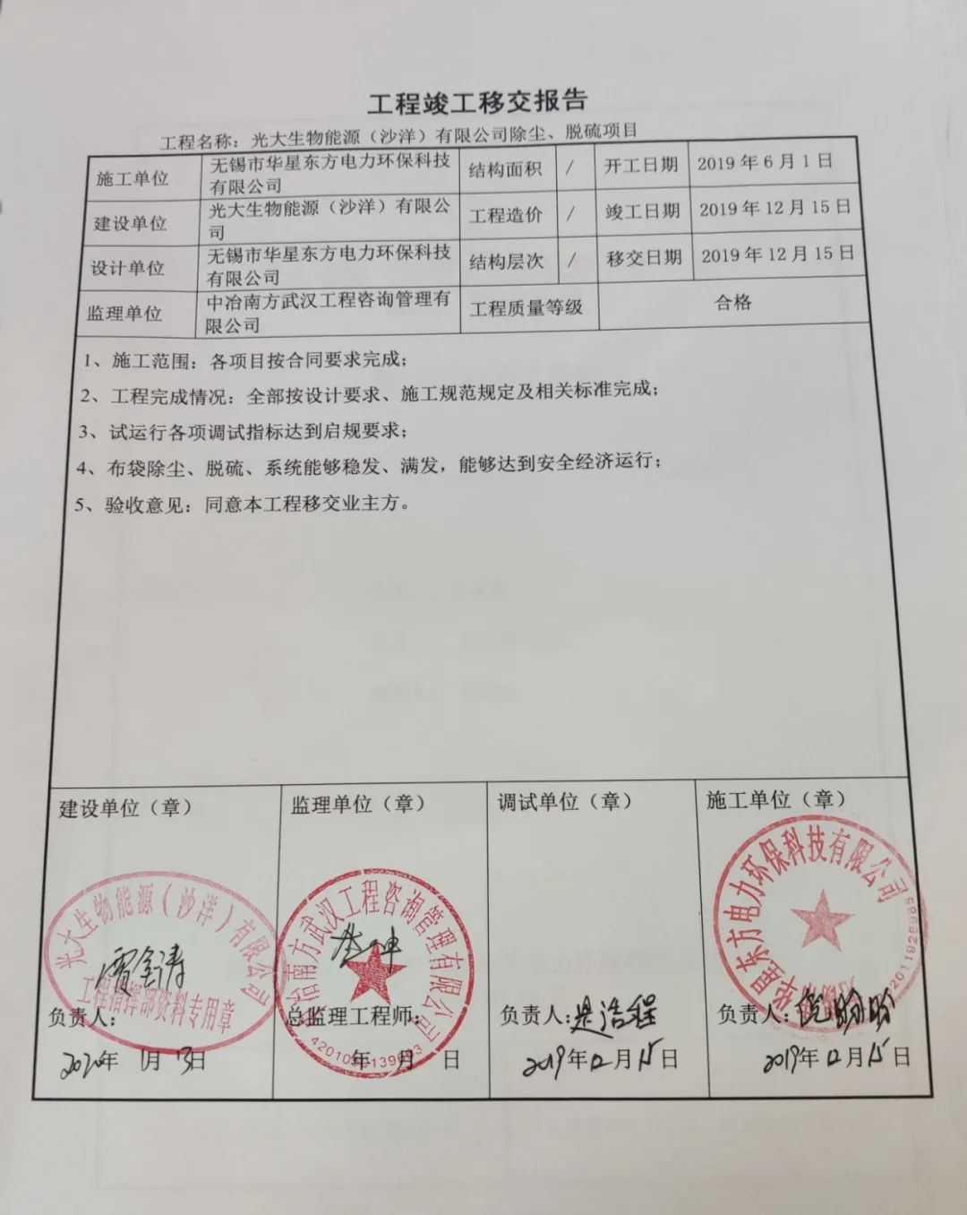 我公司承建的光大沙洋生物質發(fā)電項目煙氣凈化工程于2019年12月15日通過竣工驗收。