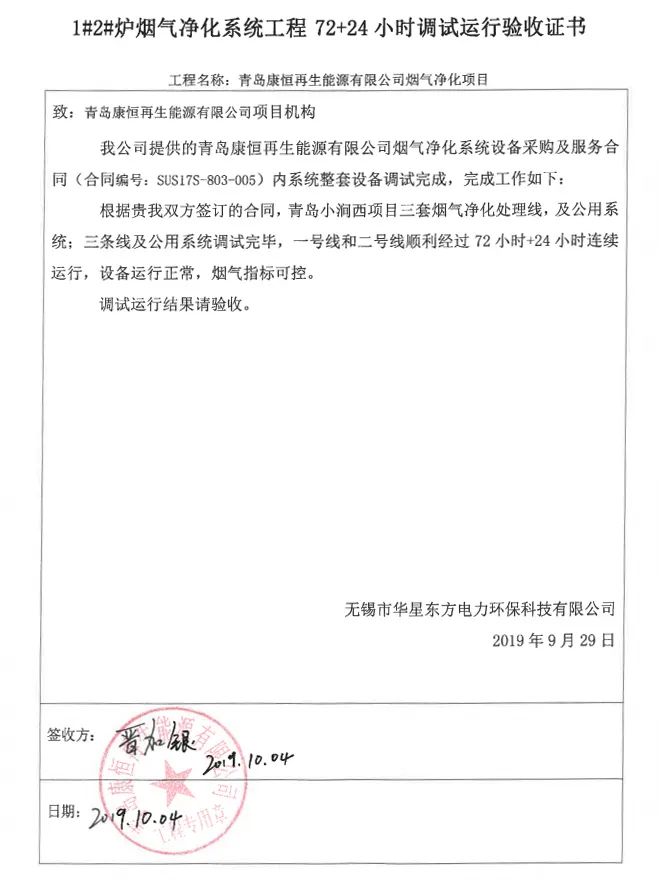 我公司承建的青島市小澗西二期3x750t/d生活垃圾+75t/d干化污泥 (焚燒) 煙氣凈化項目于2019年10月4日通過72+24小時試運行。