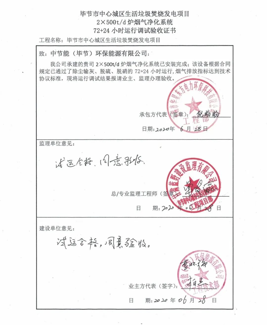 我公司承建的貴州省畢節(jié)市中心城區(qū)生活垃圾焚燒發(fā)電項(xiàng)目煙氣凈化工程于2020年6月28日通過72+24小時(shí)試運(yùn)行。