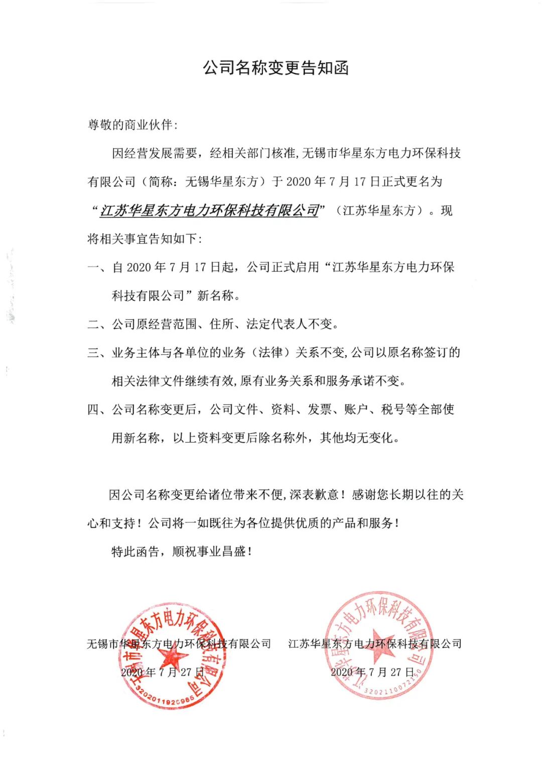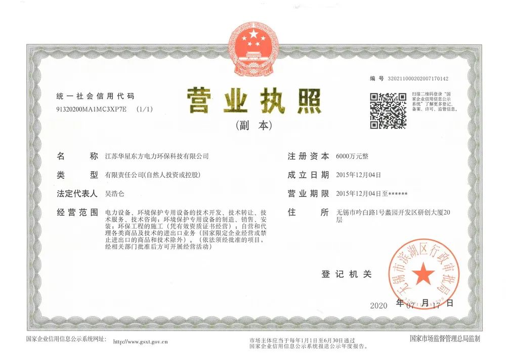 2020年7月17日,無錫市華星東方電力環(huán)??萍加邢薰菊礁麨椋骸敖K華星東方電力環(huán)??萍加邢薰尽保韵聻樽兏妫?/span>