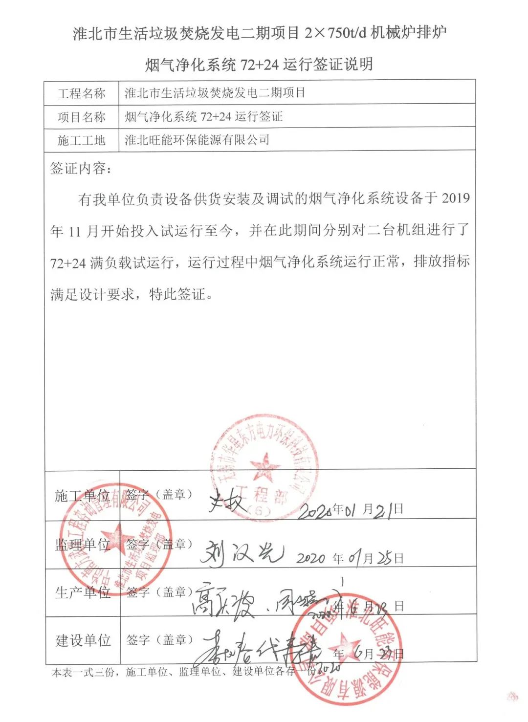 我公司承建的安徽省淮北市生活垃圾焚燒發(fā)電二期項目煙氣凈化工程于2020年6月23日通過72+24小時試運行。