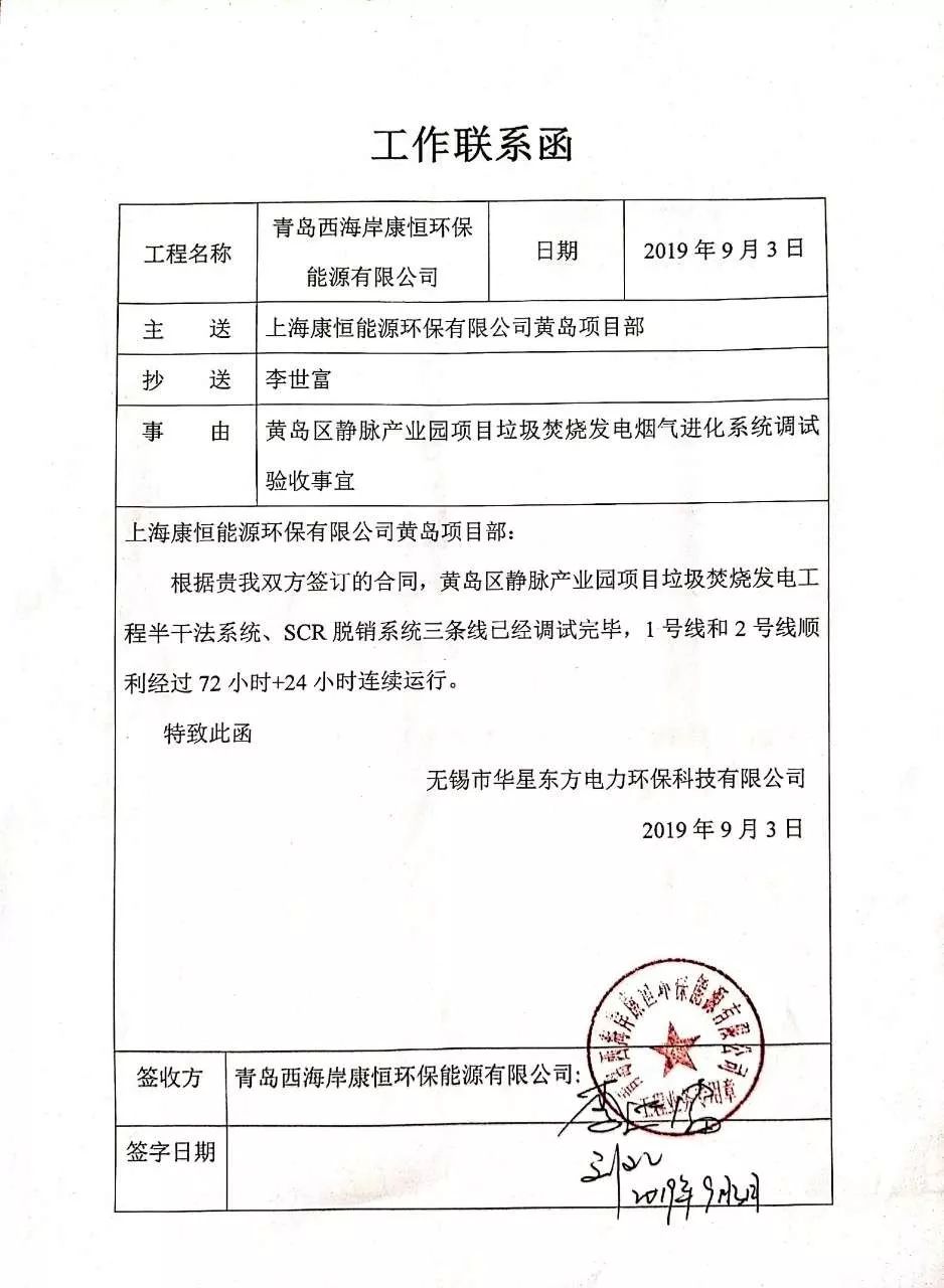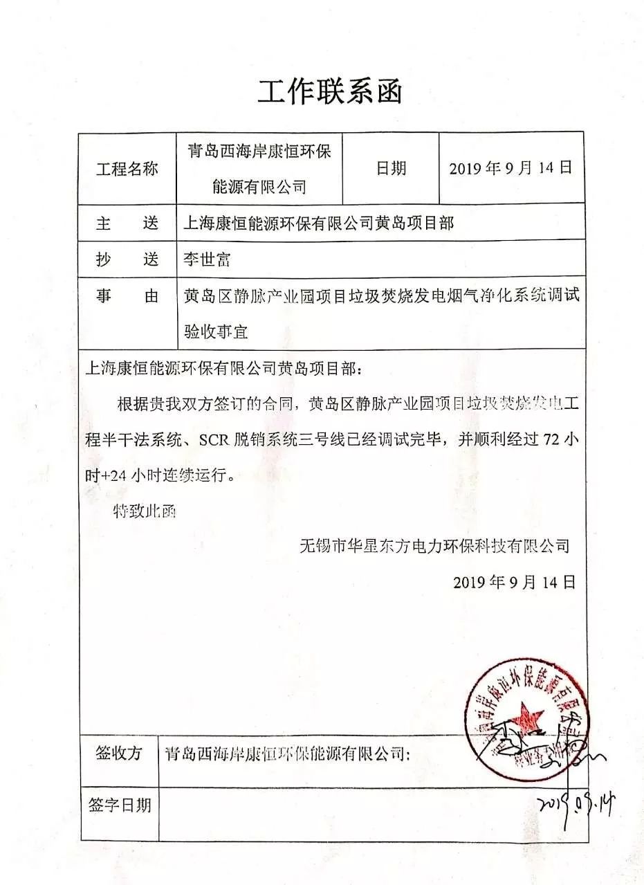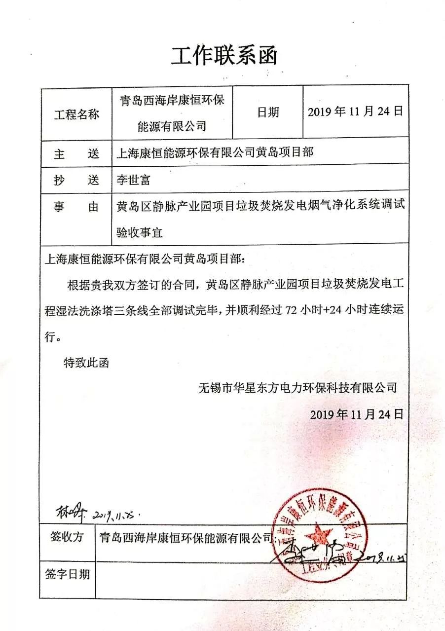 我公司承建的青島黃島區(qū)靜脈產(chǎn)業(yè)園項(xiàng)目垃圾焚燒發(fā)電超低排放煙氣凈化工程于2019年11月24日通過(guò)72+24小時(shí)運(yùn)行驗(yàn)收。