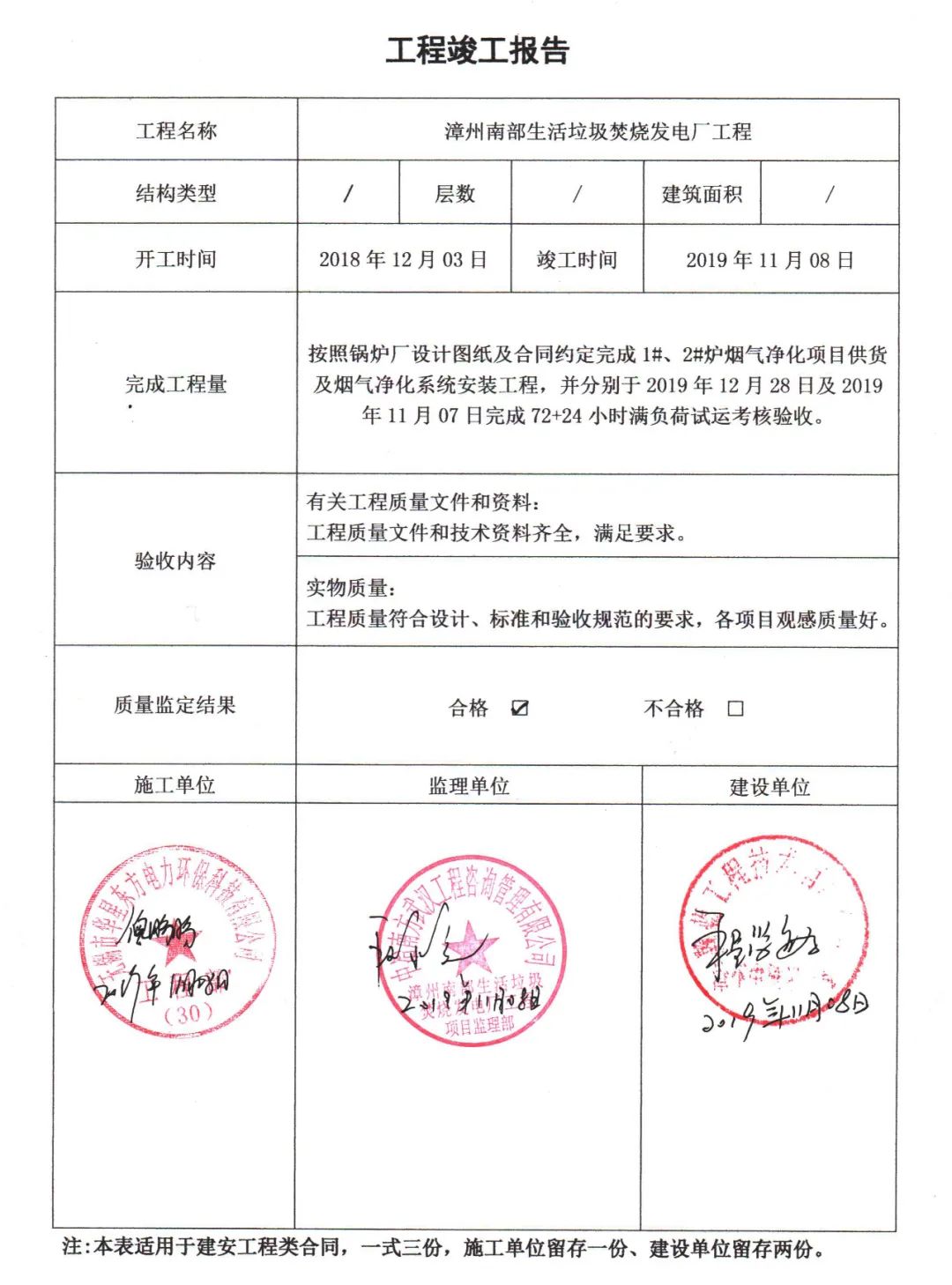 我公司承建的福建省漳州市漳州南部2x500t/d生活垃圾焚燒發(fā)電項(xiàng)目煙氣凈化工程于2019年11月8日通過竣工驗(yàn)收。