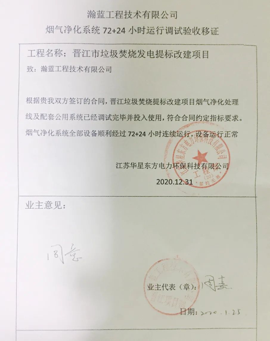 我公司承建的福建省晉江市垃圾焚燒發(fā)電提標改建項目煙氣凈化工程于2020年12月31日通過72+24小時試運行。