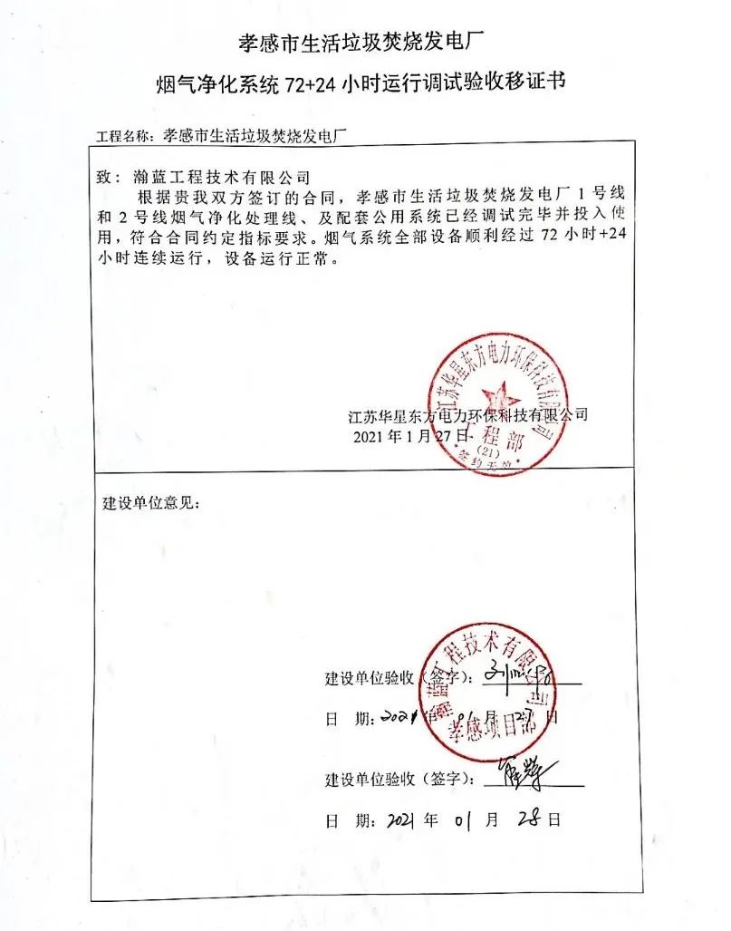 我公司承建的湖北省孝感市生活垃圾焚燒發(fā)電項目煙氣凈化工程于2021年1月28日通過72+24小時試運行。