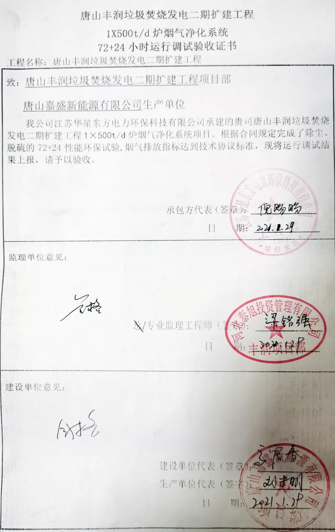 我公司承建的河北省唐山豐潤生活垃圾焚燒發(fā)電二期擴建項目煙氣凈化工程于2021年1月29日通過72+24小時試運行。