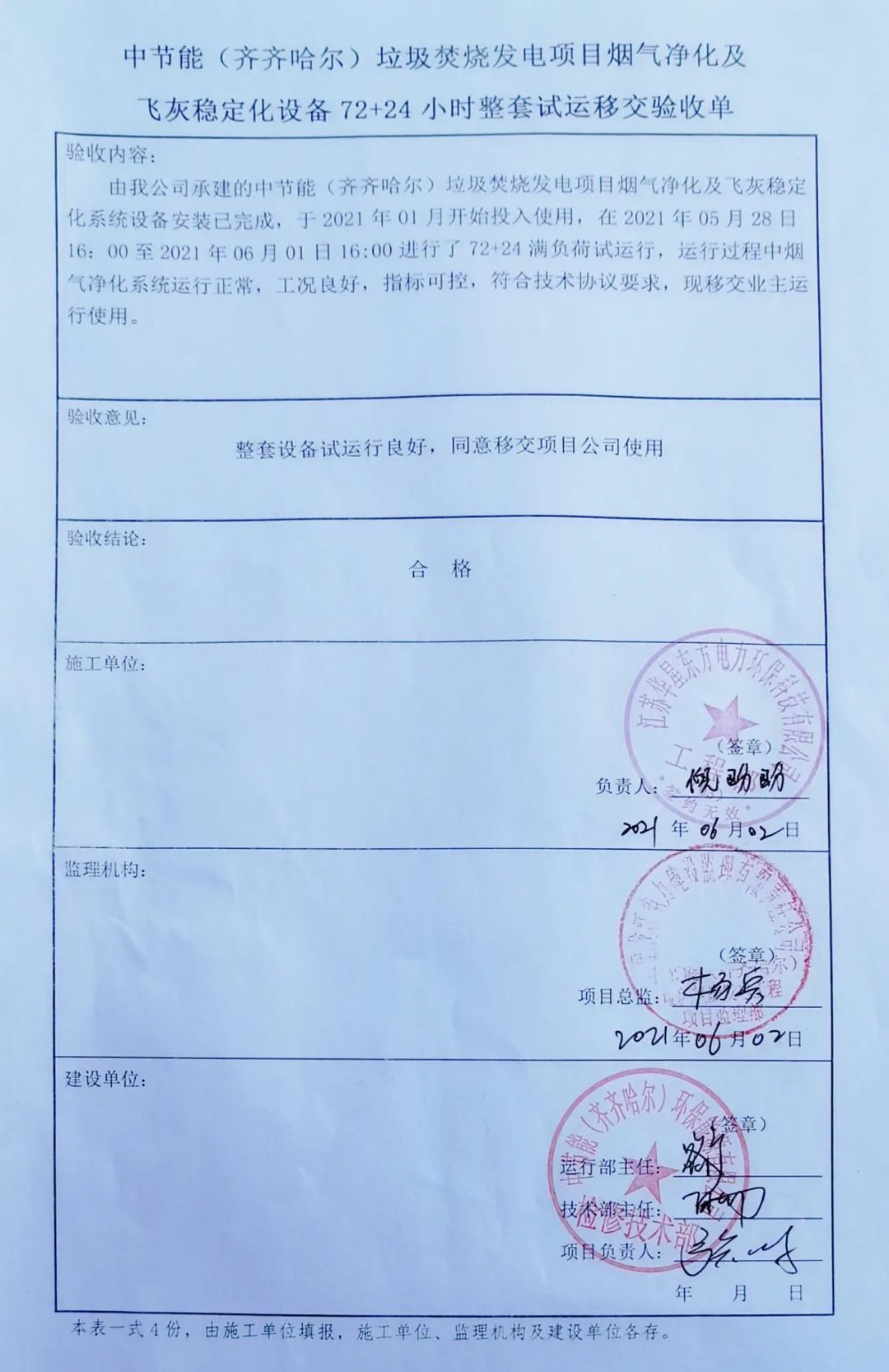 我公司承建的黑龍江省齊齊哈爾垃圾焚燒發(fā)電項(xiàng)目煙氣凈化工程于2021年6月2日通過(guò)72+24小時(shí)試運(yùn)行。