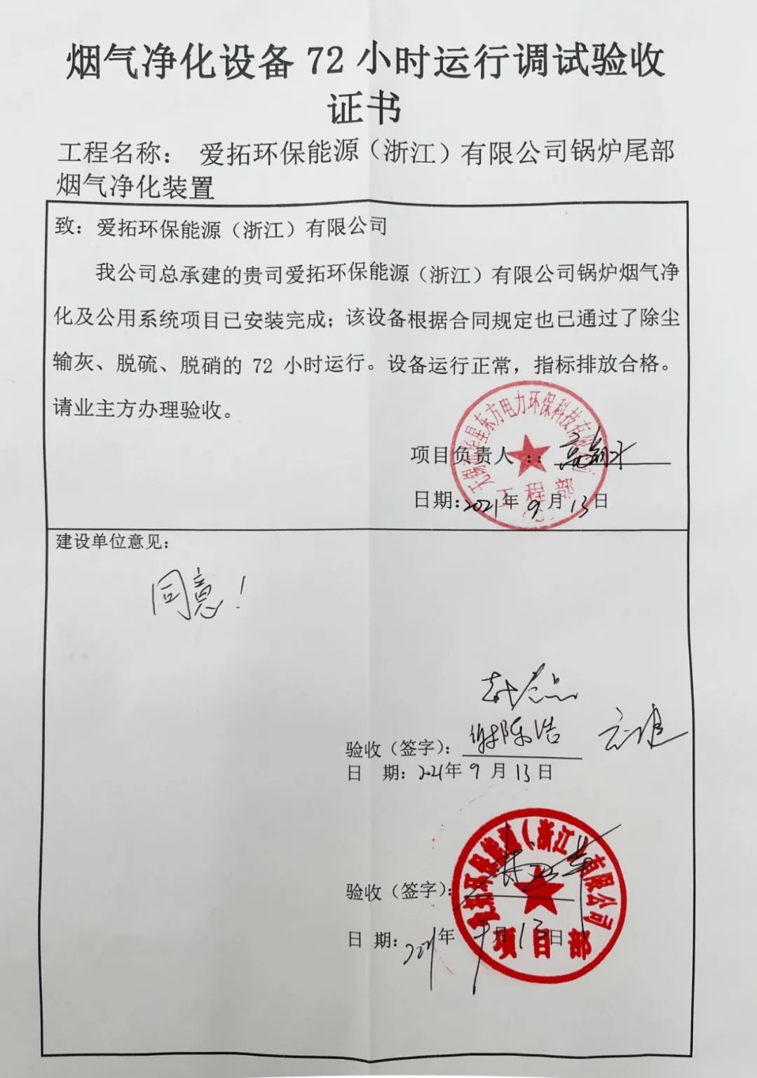 我公司承建的浙江省愛拓環(huán)保能源(浙江)有限公司鍋爐尾部煙氣凈化工程于2021年9月13日通過72+24小時試運行。