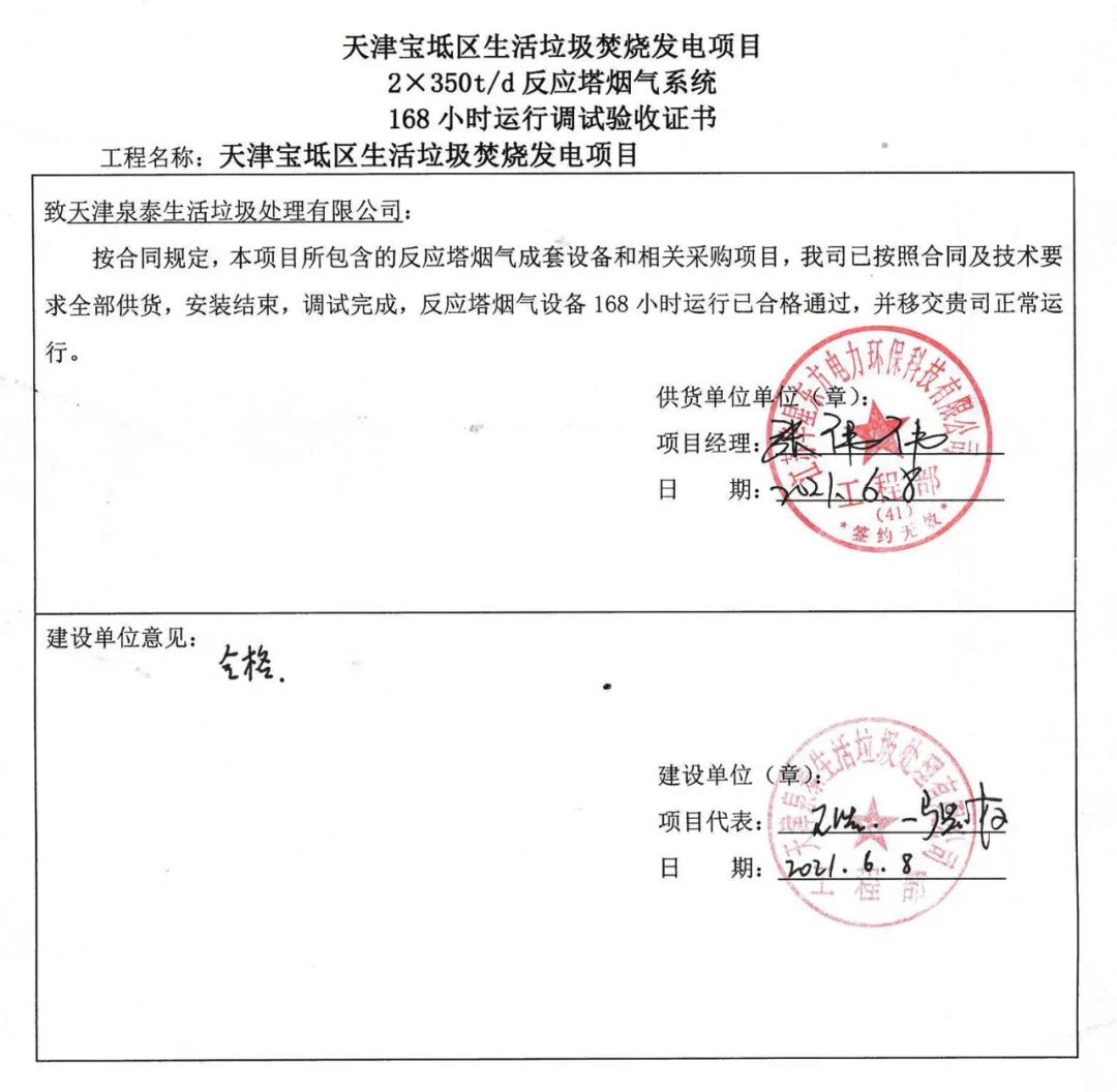 我公司承建的天津寶坻區(qū)生活垃圾焚燒發(fā)電項目煙氣凈化工程于2021年6月8日通過72+24小時試運行。
