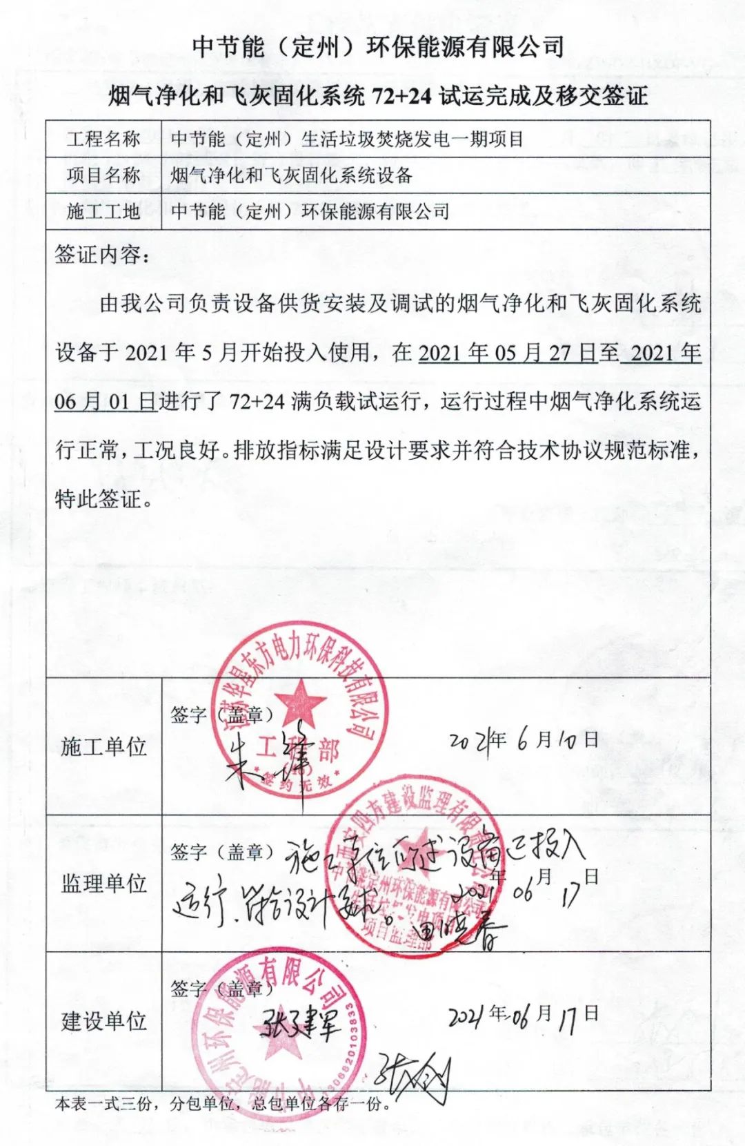 我公司承建的河北省定州市中節(jié)能定州環(huán)保能源有限公司生活垃圾焚燒發(fā)電一期項(xiàng)目煙氣凈化工程于2021年6月17日通過72+24小時(shí)試運(yùn)行。
