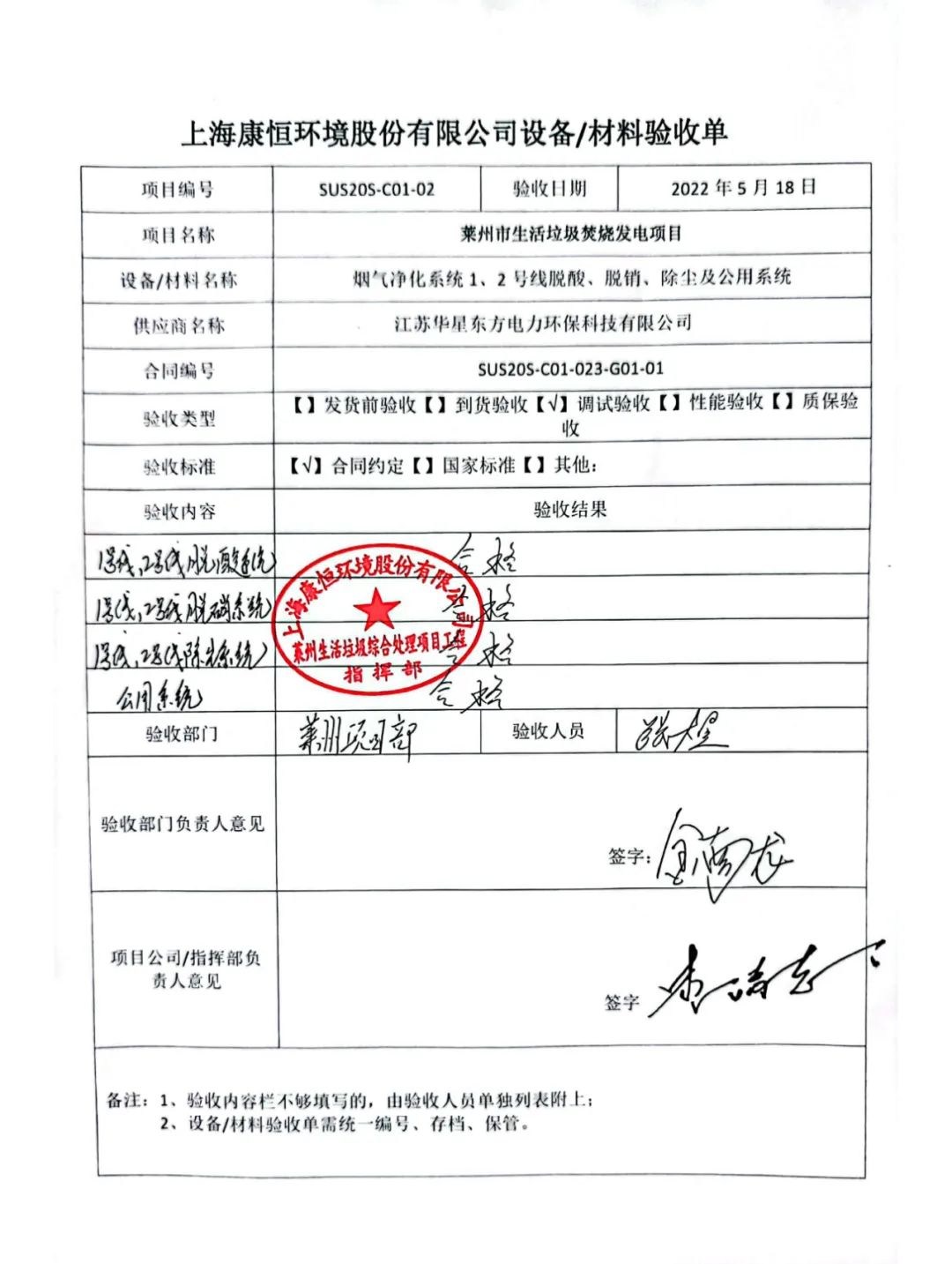 The flue gas cleaning (FGC) project undertaken by Huaxing East for Laizhou waste incineration power plant passed the 72+24 hours trial operation on May 18, 2022.
