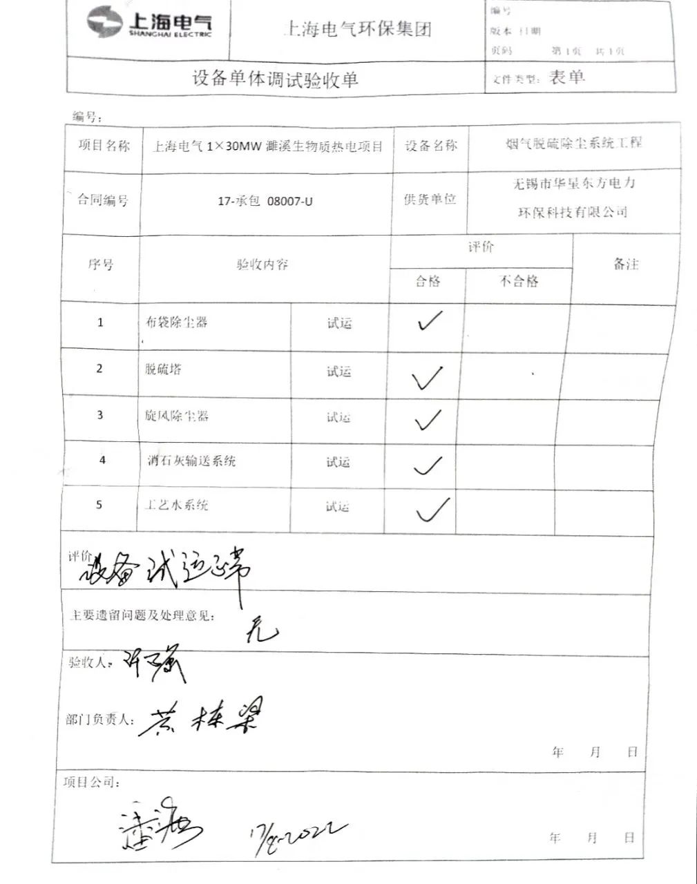 我公司承建的安徽省淮北市濉溪生物質(zhì)發(fā)電項目煙氣凈化工程于2022年8月17日通過調(diào)試驗收。