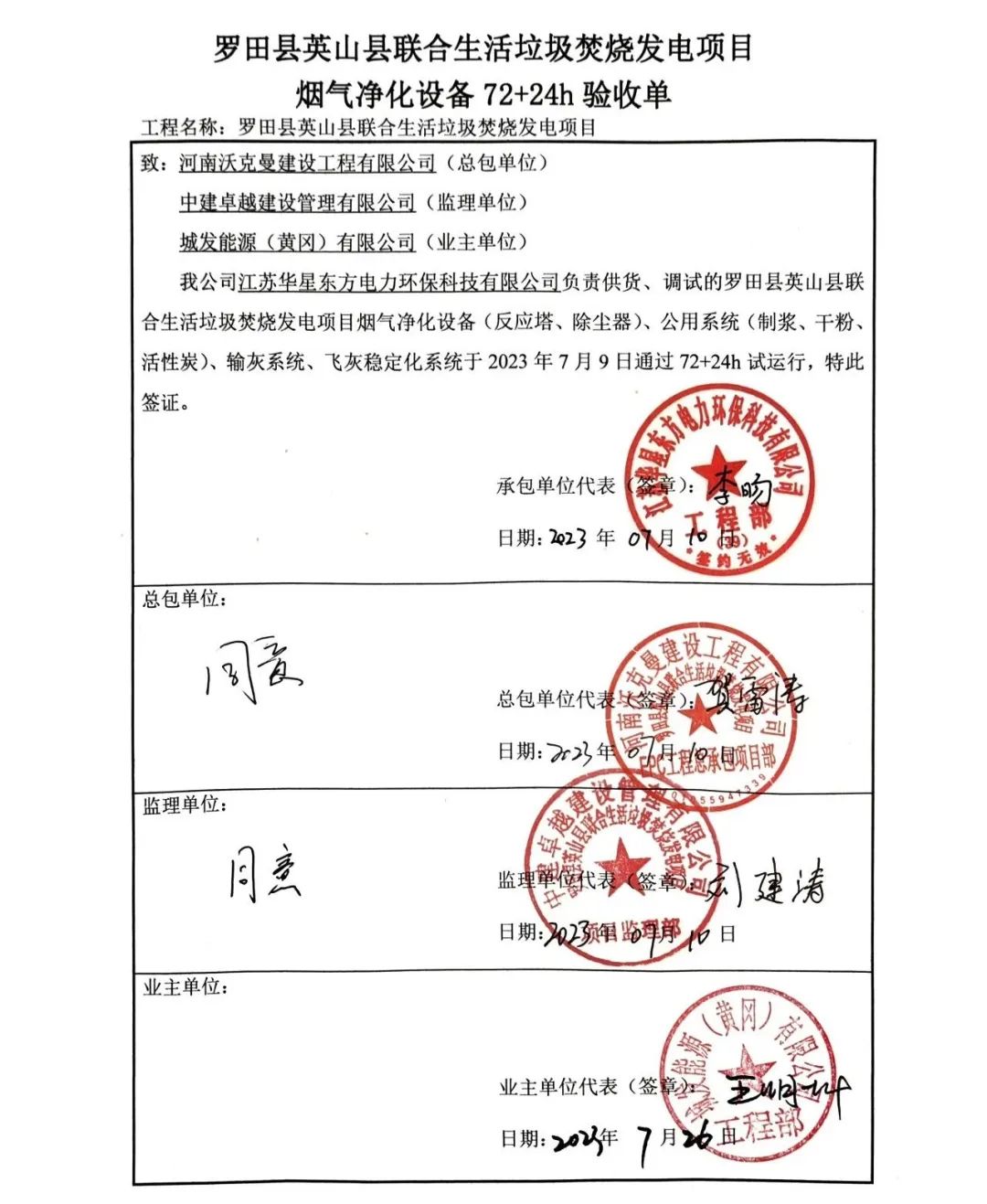 我公司承建的湖北省黃岡市羅田生活垃圾焚燒發(fā)電項(xiàng)目煙氣凈化工程于2023年07月09日通過(guò)72+24小時(shí)試運(yùn)行。 The flue gas purification project of the Luotian domestic waste incineration power generation project in Huanggang City, Hubei Province, undertaken by our company, passed the 72+24-hour trial operation on July 9, 2023.