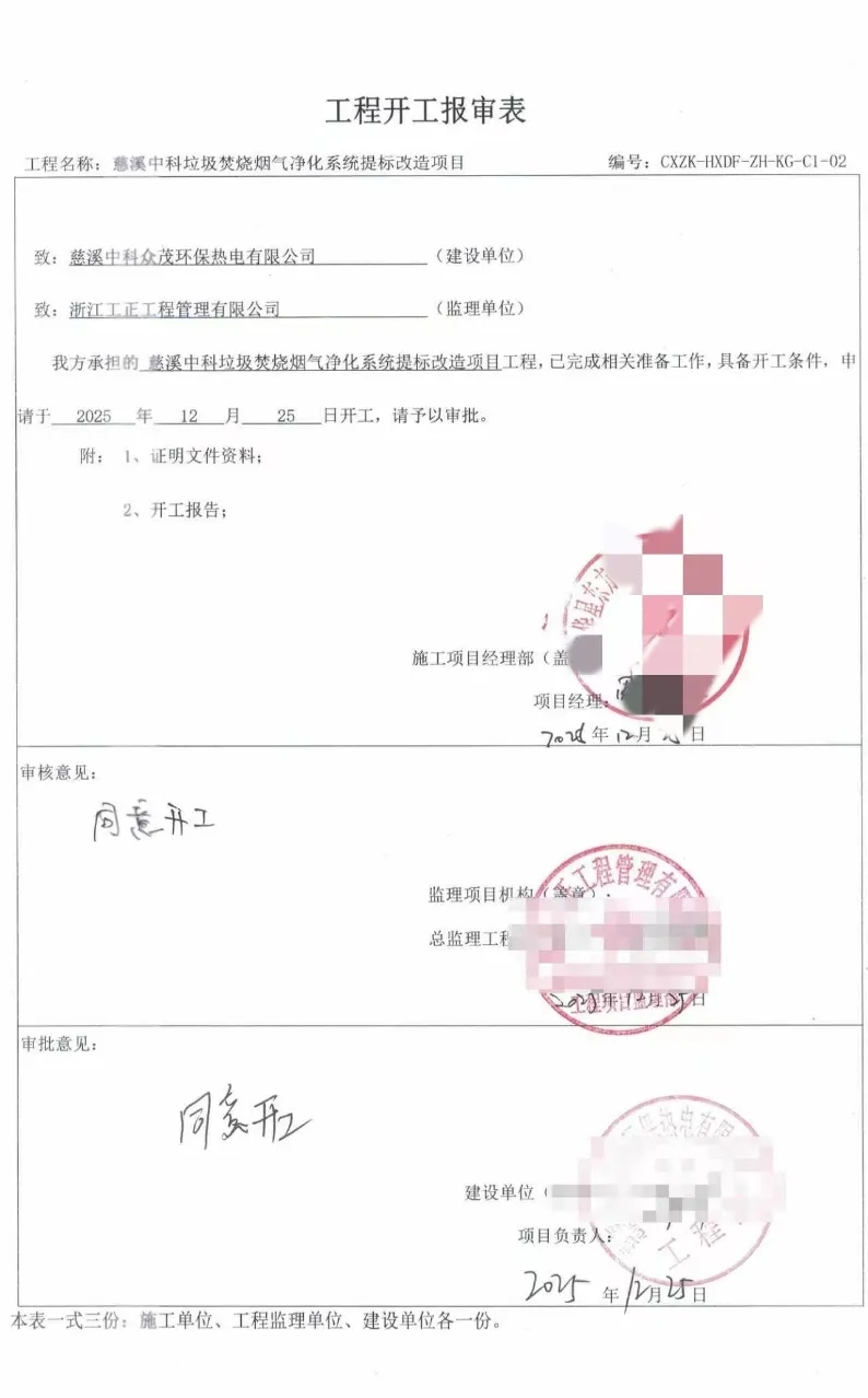 我公司承建的浙江省寧波市慈溪生活垃圾焚燒發(fā)電項目煙氣凈化提標改造工程于2025年12月25日開工建設。