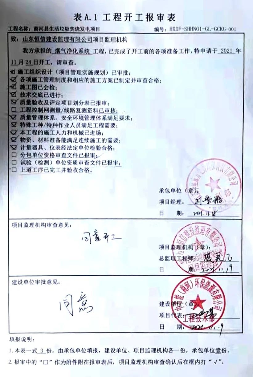 我公司承建的山東省商河縣生活垃圾焚燒發(fā)電項(xiàng)目煙氣凈化工程于2021年11月19日開工建設(shè)。