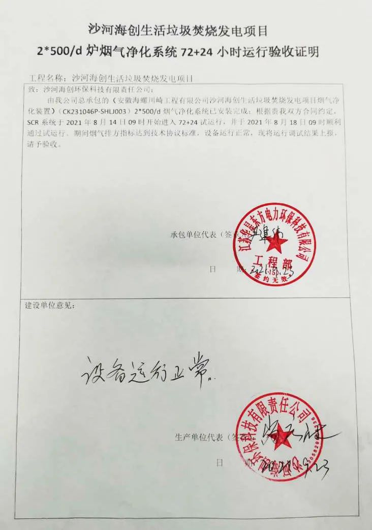 我公司承建的河北省邢臺(tái)沙河海創(chuàng)生活垃圾焚燒發(fā)電項(xiàng)目煙氣凈化工程于2021年6月19日通過72+24小時(shí)試運(yùn)行。