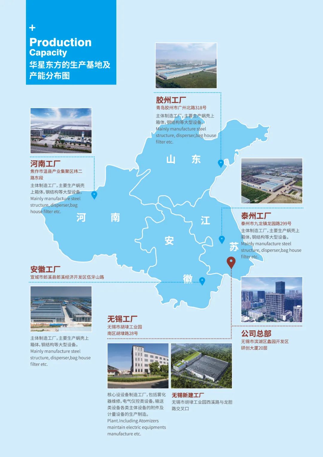 繼江蘇華星東方“安徽中易環(huán)?!逼脚_的設(shè)備和催化劑等生產(chǎn)裝備的投入,專注于不銹鋼,精密加工及電控產(chǎn)品為主的無錫二期工廠也將在9月陸續(xù)達(dá)產(chǎn)。江蘇華星東方自工程設(shè)計(jì)體系搬遷至無錫CBD區(qū)蠡園開發(fā)區(qū),逐步構(gòu)建起以蠡園開發(fā)區(qū)為工程設(shè)計(jì)研發(fā)、無錫為精密加工、宣城為催化劑新材料、焦作、青島、泰州為鋼結(jié)構(gòu)制造的產(chǎn)能體系。合理化的產(chǎn)能結(jié)構(gòu)分布,為成本控制及新一輪的縣域煙氣治理需求提供了最佳選擇方案和最優(yōu)的成本控制布局。 Following Jiangsu Huaxing-east's investment in steel and catalyst fabrication machinary on the "Anhui Zhongyi EP" platform, the Wuxi Phase II factory, which focuses on stainless steel, precision machining, and electronic control products, will also gradually reach production in September, 2023. Huaxing-east relocated its engineering and design dept. to Liyuan Development Zone in CBD Wuxi, gradually building a production structure with Liyuan Development Zone as the design center, Wuxi factory as precision processing, Xuancheng factory as catalyst & new materials, and Jiaozuo / Qingdao / Taizhou as steel structure fabrication. The rational distribution of production capacity provides the best choice and optimal cost control layout for the new round of county level FGC demands.