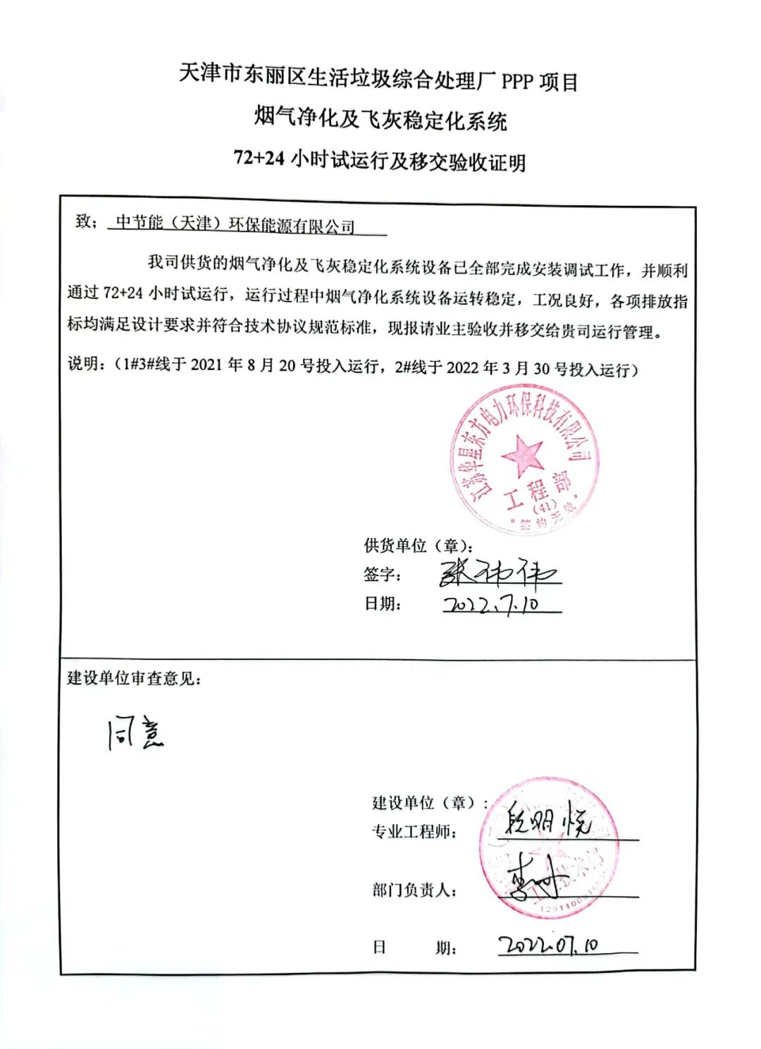 我公司承建的天津市東麗區(qū)生活垃圾焚燒發(fā)電項(xiàng)目煙氣凈化工程于2022年07月10日通過72+24小時(shí)試運(yùn)行。 The FGC project undertaken by Huaxing for the waste incineration plant in Dongli, Tianjin passed 72+24 hours trial operation on July 10, 2022.